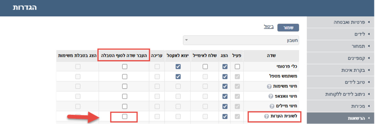 ניתן גם לסמן את הצ'קבוקס בעמודה "העבר לסוף הטבלה", ואז עמודת ההערות תופיע בסוף טבלת הלידים לאחר השדות הדינאמיים.