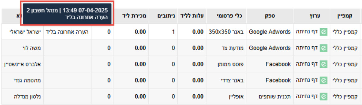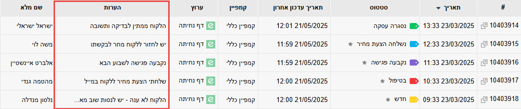 1. בעמודת ה"הערות" שבטבלת הלידים ניתן לראות את ההערה האחרונה בליד (או את חלקה אם מדובר בהערה ארוכה).