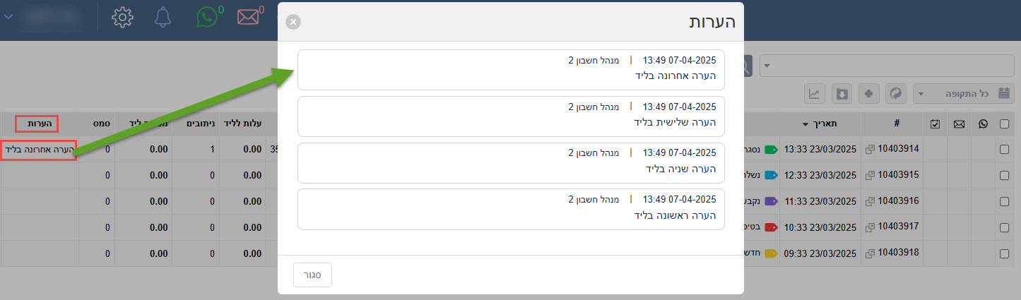3. בהקלקה על שדה ההערה יפתח חלון ובו ניתן לצפות בכל ההערות בליד.