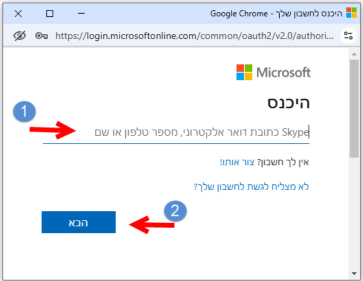 - בחלון שיפתח יש להזין את הכתובת של תיבת האאוטלוק שלכם > לאחר מכן, יש להזין את הסיסמה של תיבת האאוטלוק שלכם > לאחר מכן, יש להזין קוד חד פעמי