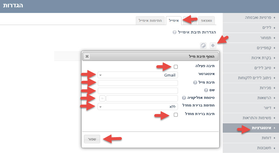 >> לחצו כאן למעבר להסבר הגדרת אינטגרציה לתיבת ג'ימייל (Gmail)