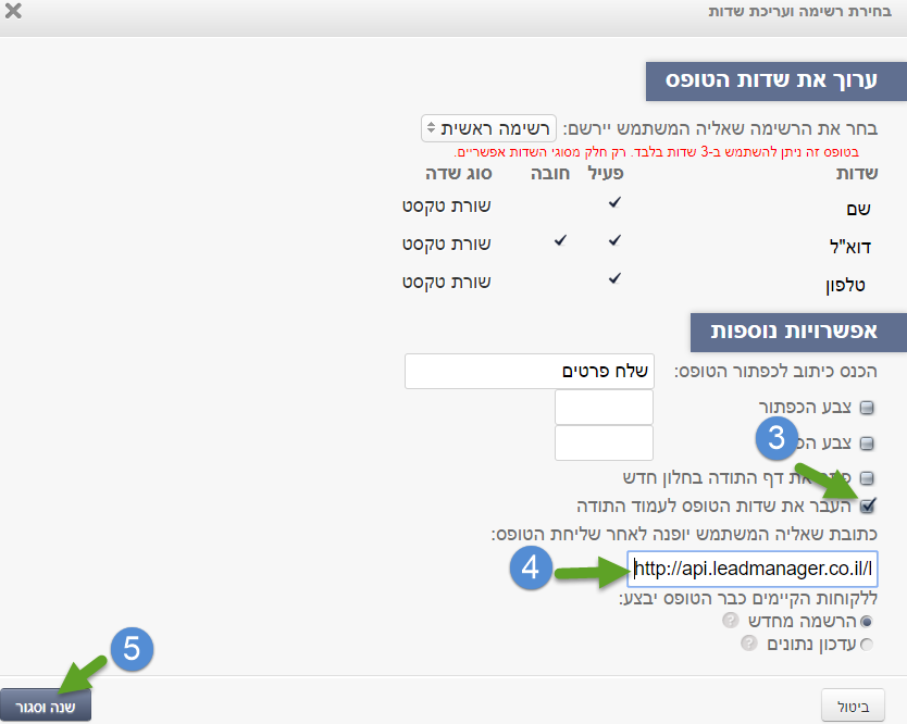 - בשורה תחת "כתובת שאליה המשתמש יופנה לאחר שליחת הטופס", יש להדביק את קוד ה API שהוצאנו מהערוץ הרלוונטי במערכת ליד מנג'ר
